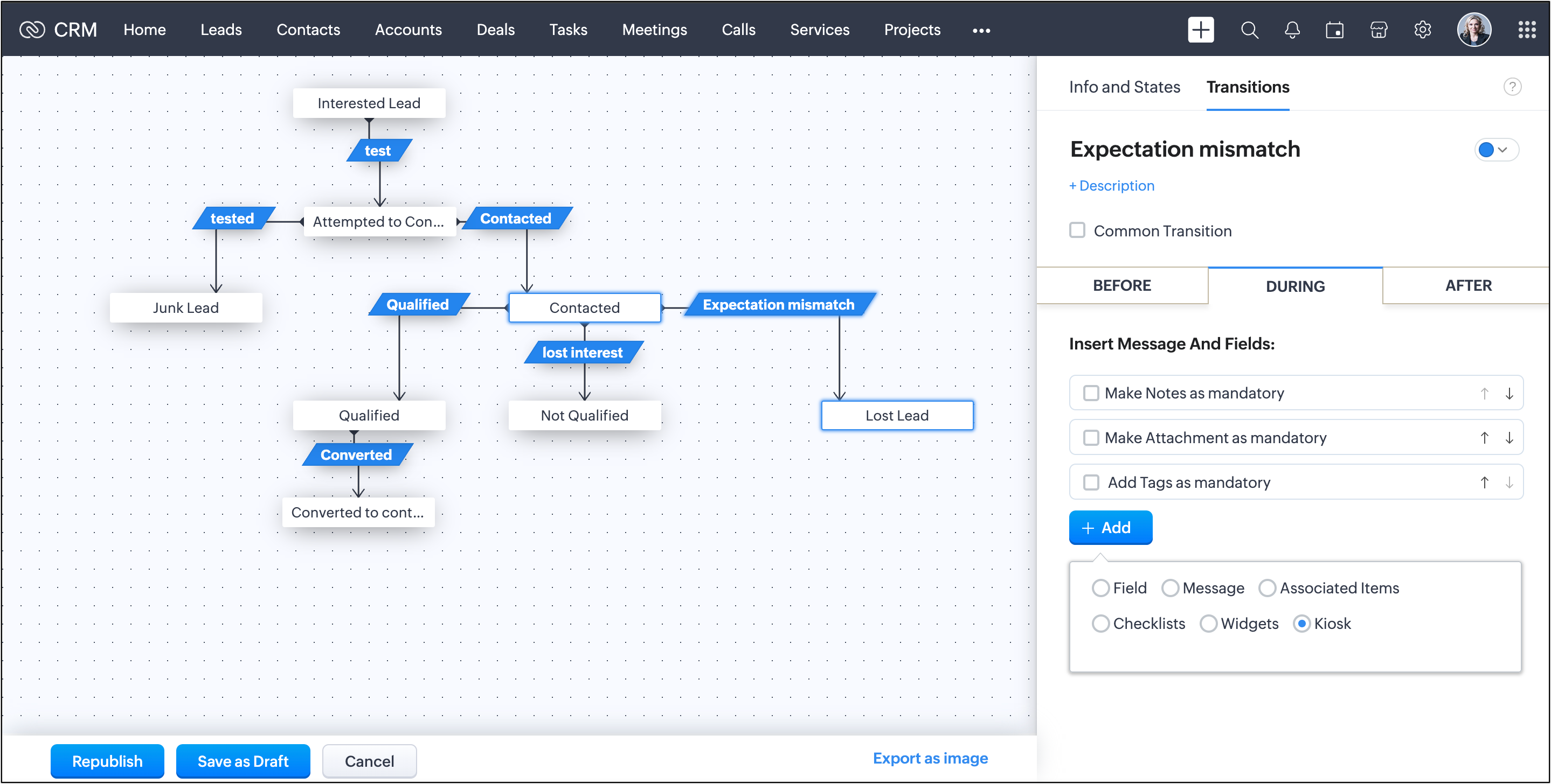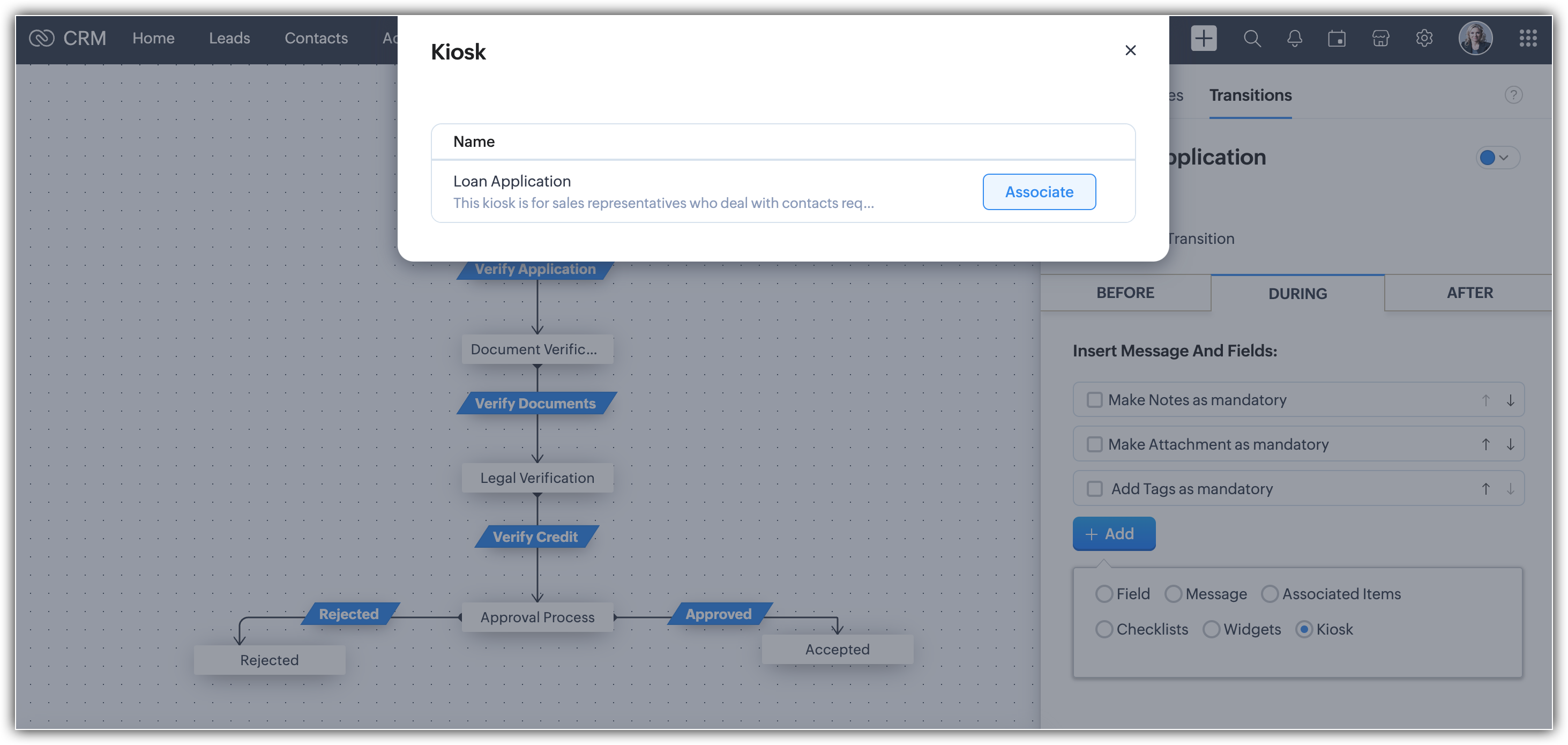 【Zoho CRM】キオスク機能に関するアップデートのお知らせ:ブループリントの遷移設定にキオスクを関連付けできるようになりました。