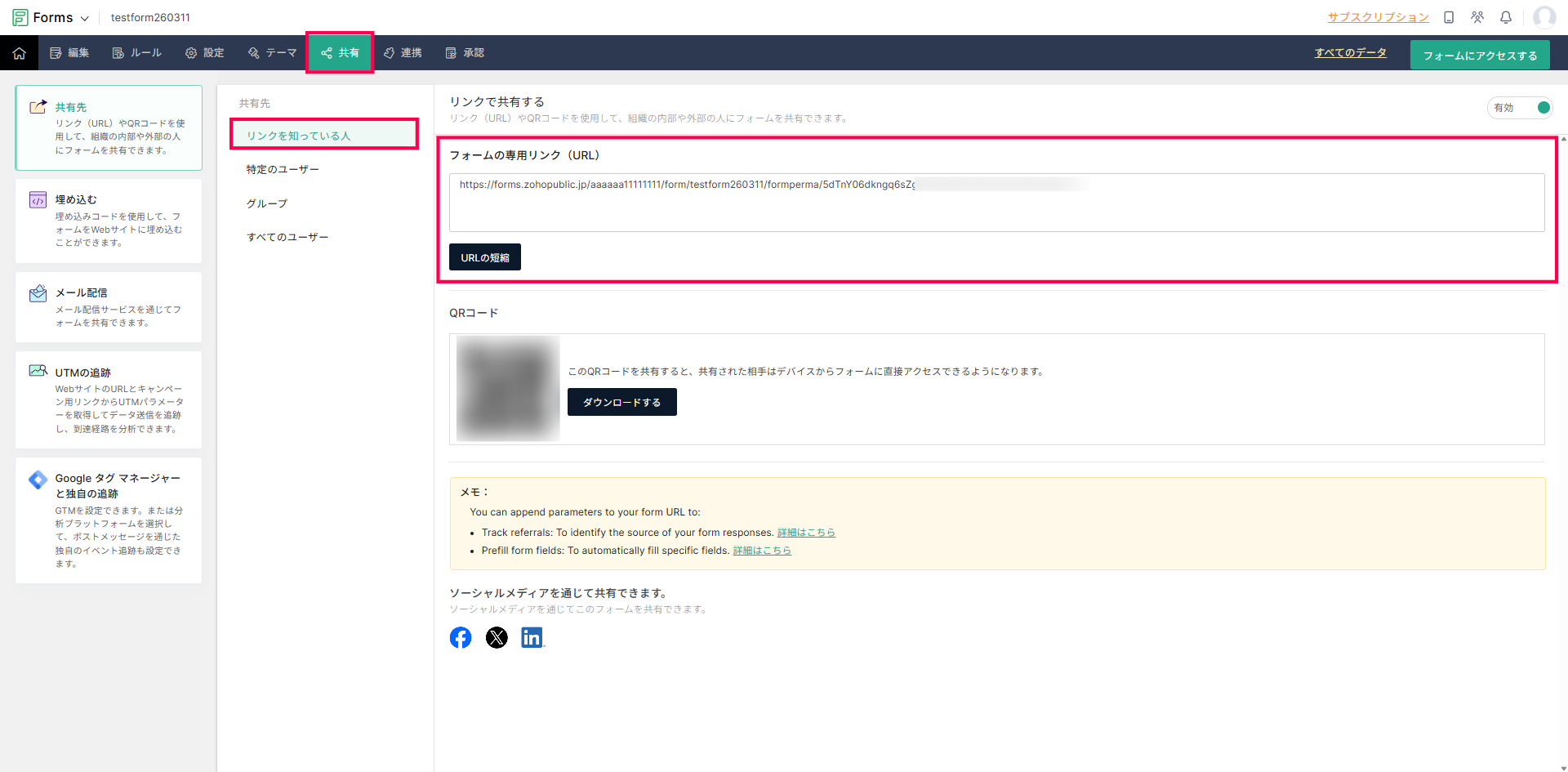 フォーム編集画面>共有>共有先>リンクを知っている人 から取得できるURLは、回答をいただく外部(同じZoho Forms組織のユーザー以外)の方へ共有する用途のものです。