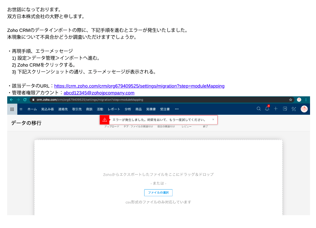 ゾーホージャパン Zohoサポートチームでは、お問合せ頂いた問題を早期に把握・解決したく存じます。つきましては、お客様に、お問合せ内容と併せて何点か情報を頂きたく存じます。