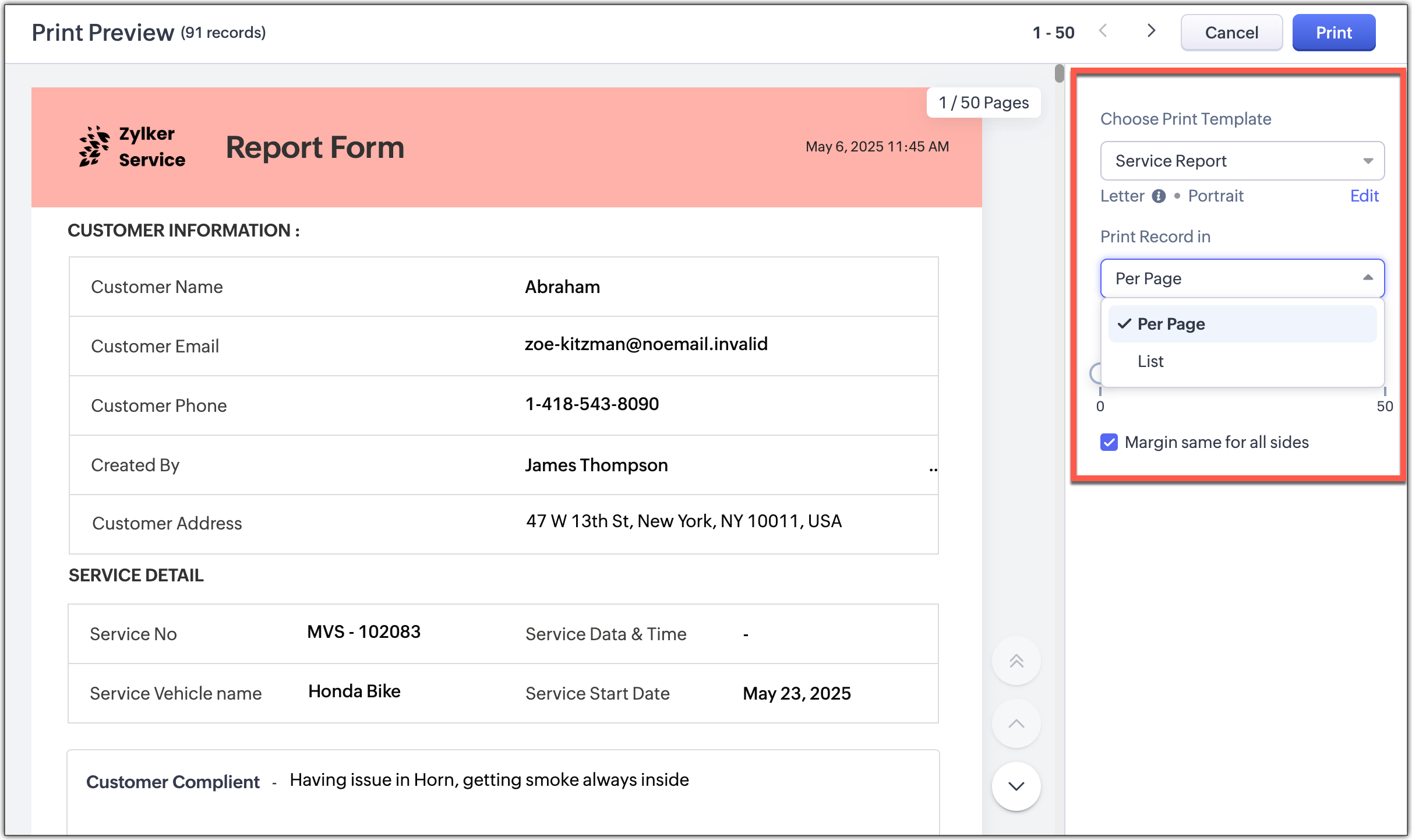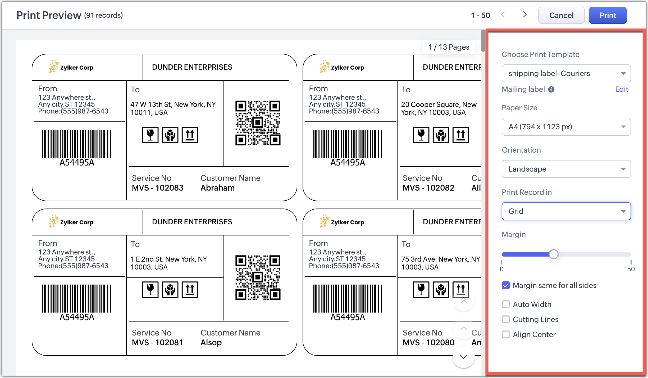 配送サービスや宅配便事業を運営しており、顧客データをすべてZoho CRMで管理していると想定してください。チームは日々の配達用に住所ラベルを作成する必要があります。印刷表示を使用して以下の操作が可能です: