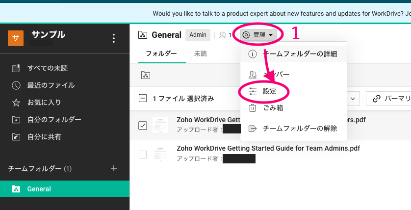 特権管理者は、プロファイル設定でメールアドレスを変更することにより、 自分の役割をチーム管理者に割り当てできます。 ・WorkDriveアカウントの左上隅にあるチーム名をクリックしてください。 ・ドロップダウンから「管理コンソール」を選択してください。管理コンソールページが新しいタブで開きます。 ・左側のパネルで「設定」をクリックします。プロファイル設定はデフォルトで表示できます。 ・特権管理者の連絡先の横にある「変更」をクリックします。ダイアログボックスが開きます。 ...