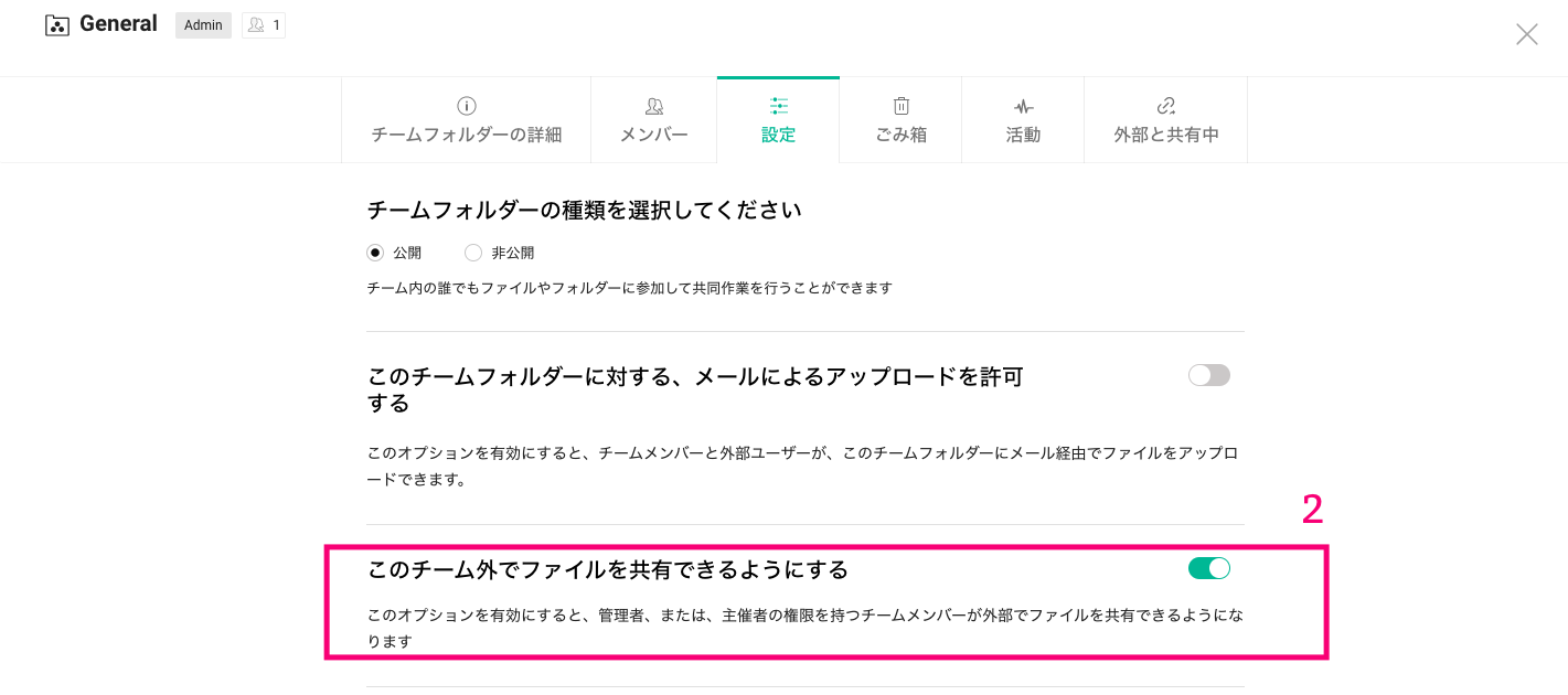 チームフォルダー画面上部の「管理」>「設定」へ進み、「このチーム外でファイルを共有できるようにする」をOFFに設定してください。
