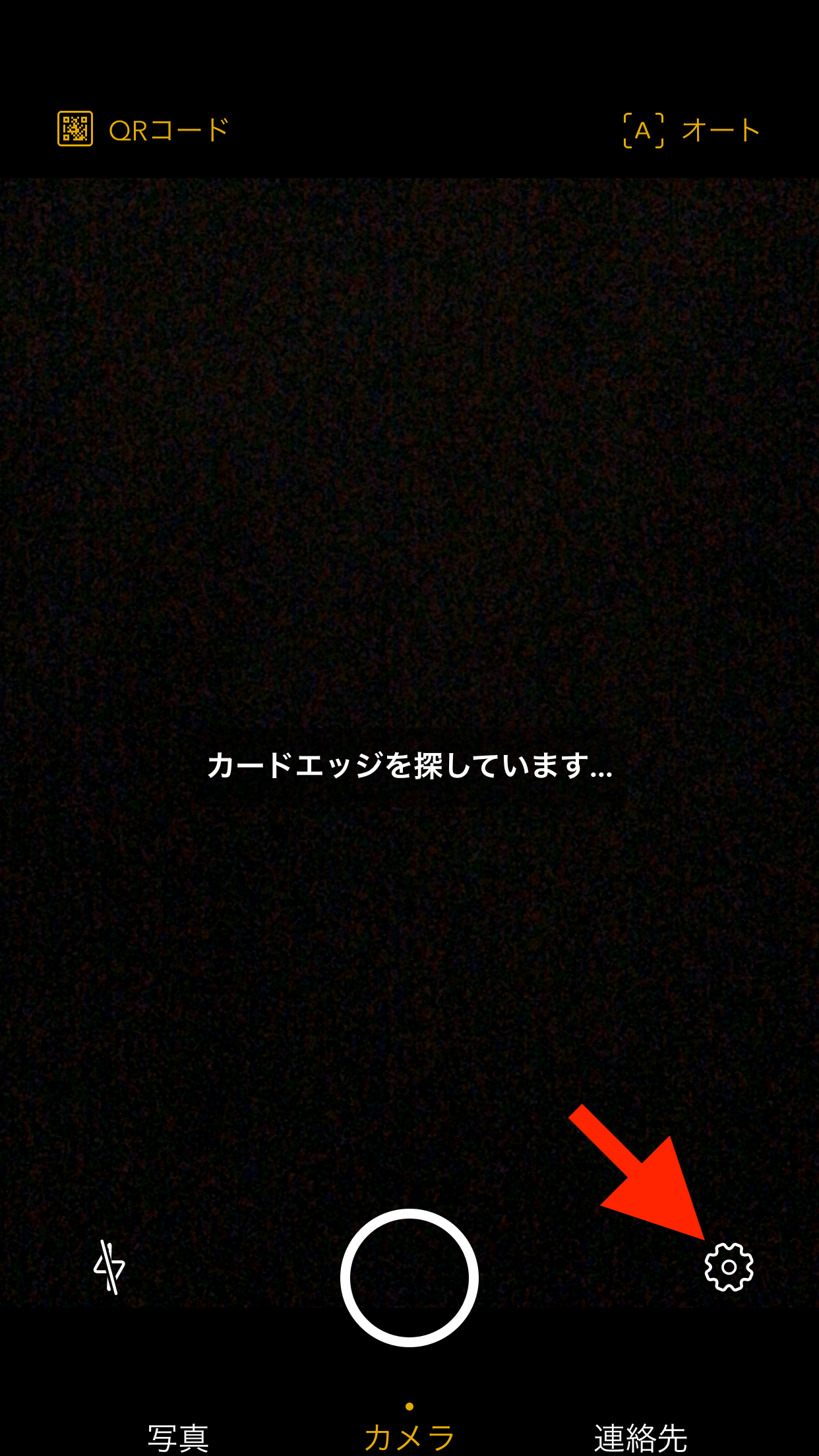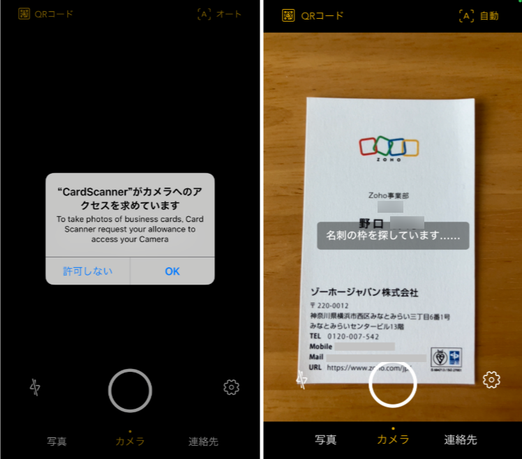 ①Card Scannerアプリを起動後、カメラへのアクセスを許可し、名刺を撮影します。