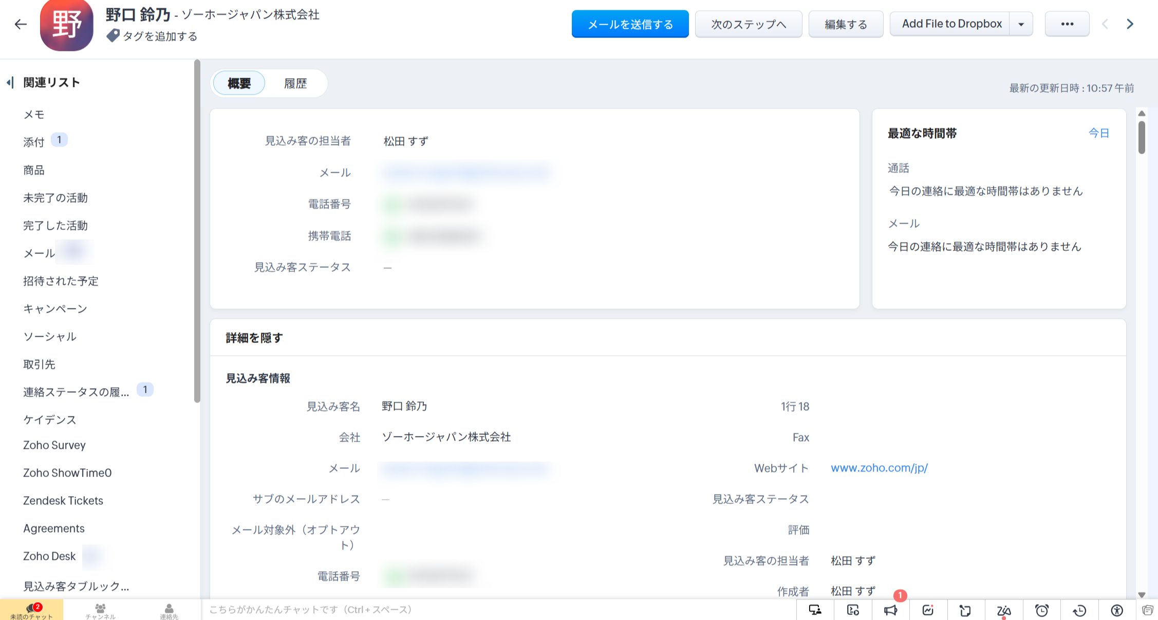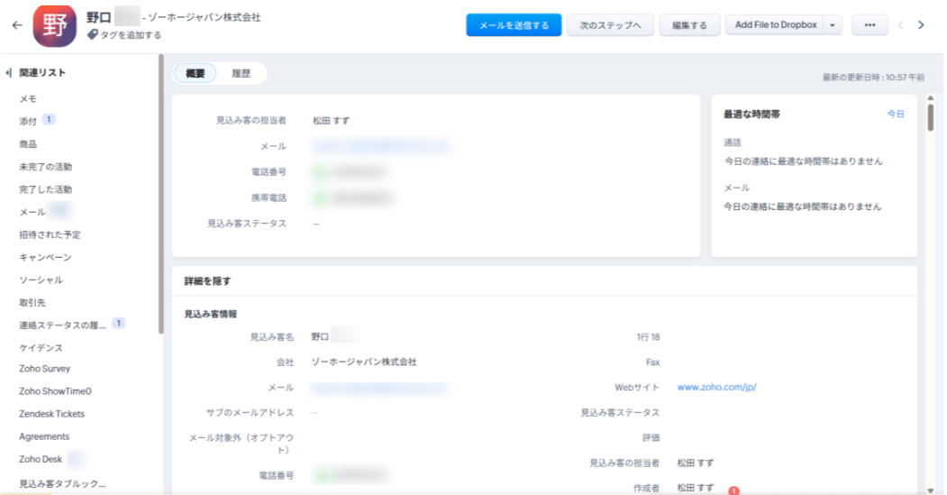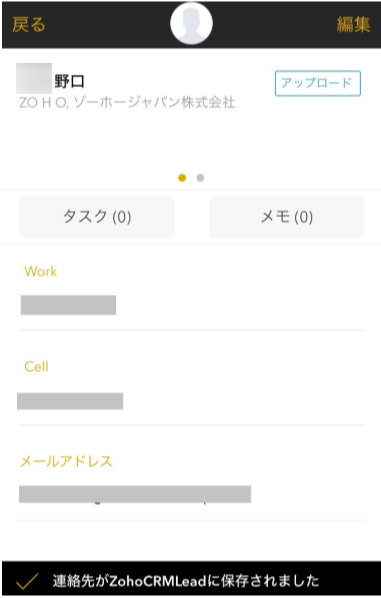 ⑥Zoho CRMにデータが保存されます。保存されたデータはCRMの画面から確認できます。