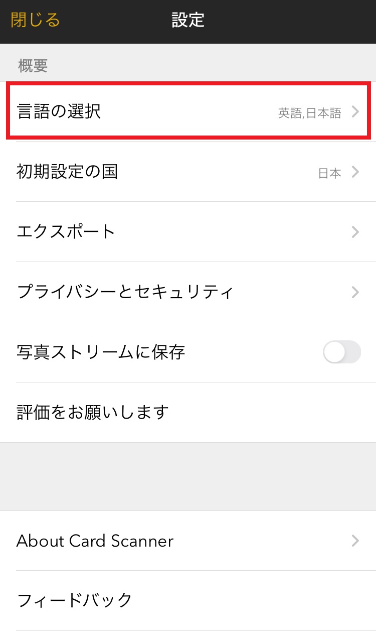 Card Scannerアプリの起動時に、右下の歯車マークをタップするで、自分のZohoアカウント名の表示がされているか、また追加言語設定が完了しているか確認できます。