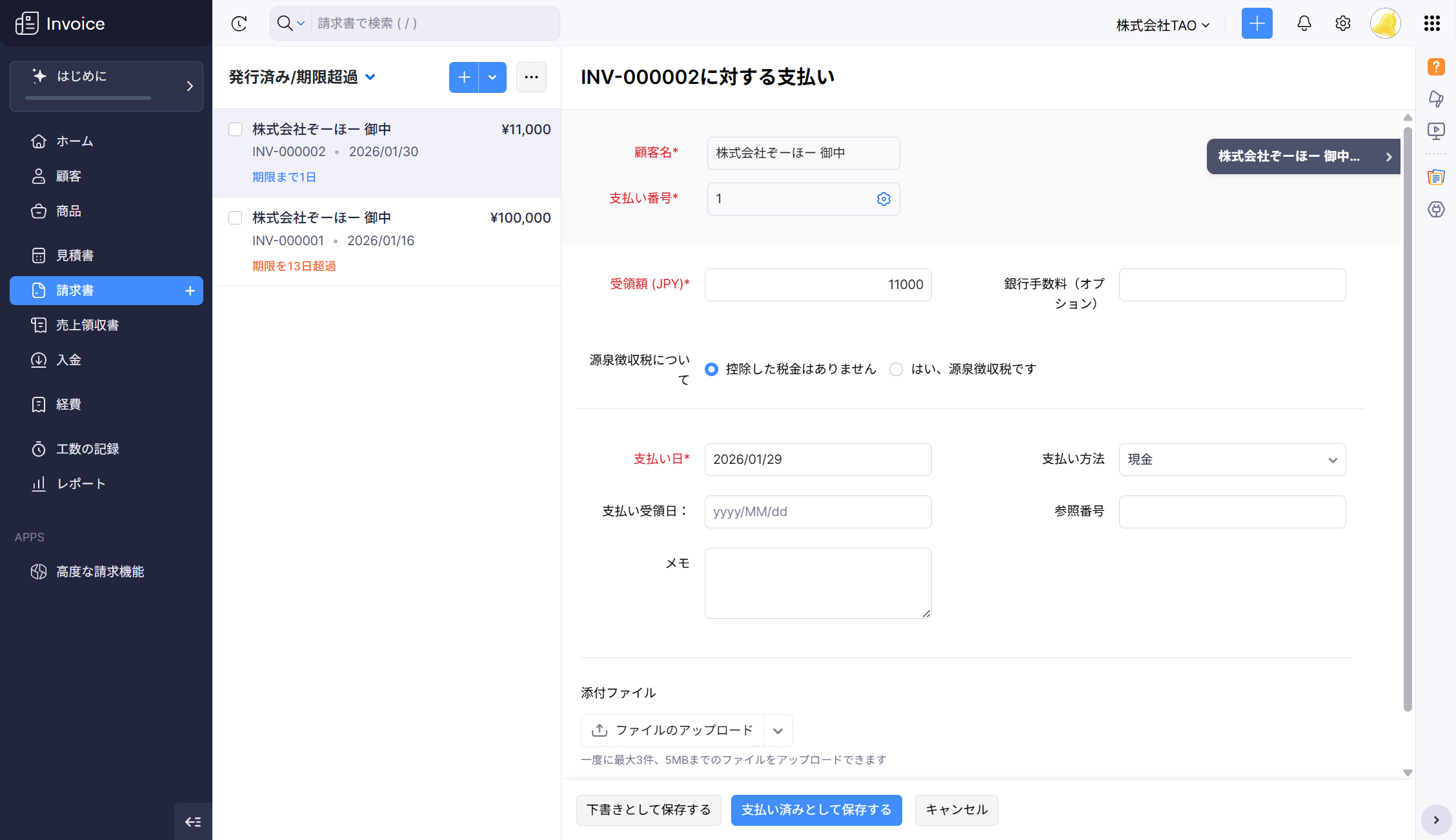 【Zoho Invoice】受領済みの支払いの記録方法
