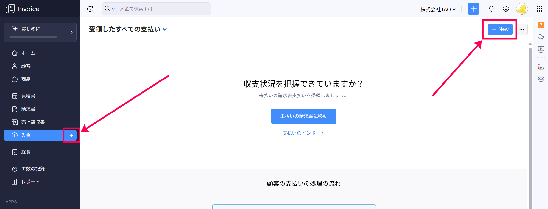受領済みの支払いの記録は、「入金」タブ右の「+」もしくは、「入金」タブ画面内にある「+New」ボタンから可能です。