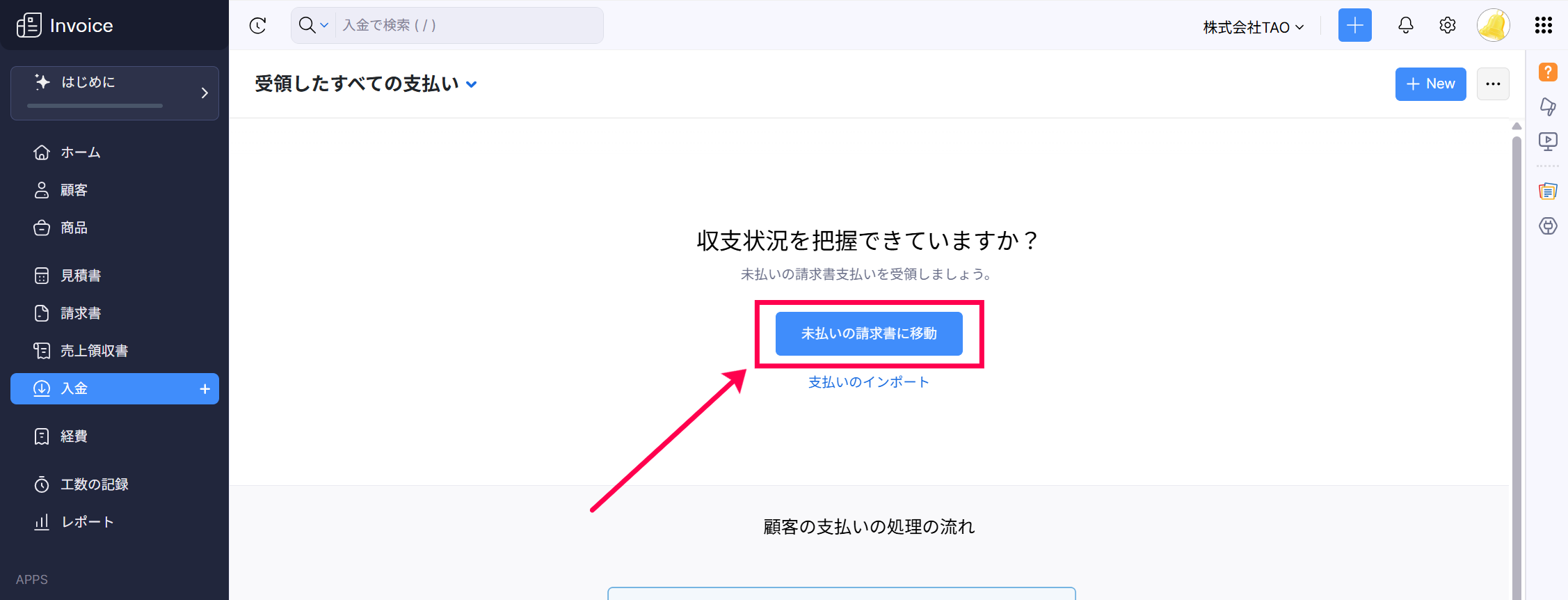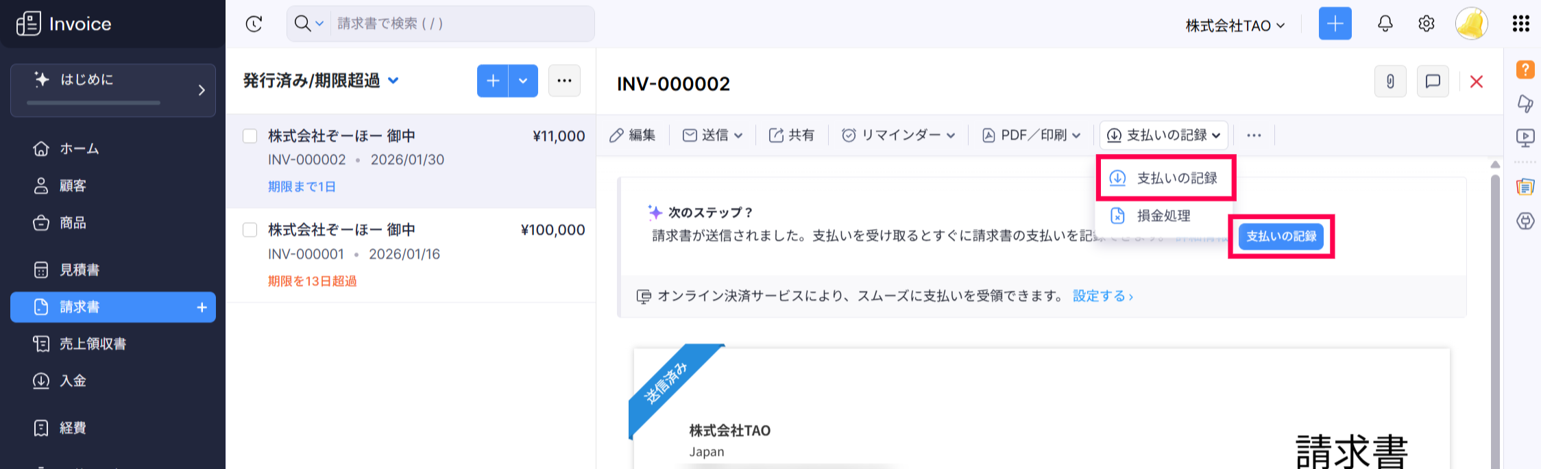 また、「未払いの請求書に移動」ボタンからも、受領済みの支払いの記録が可能です。