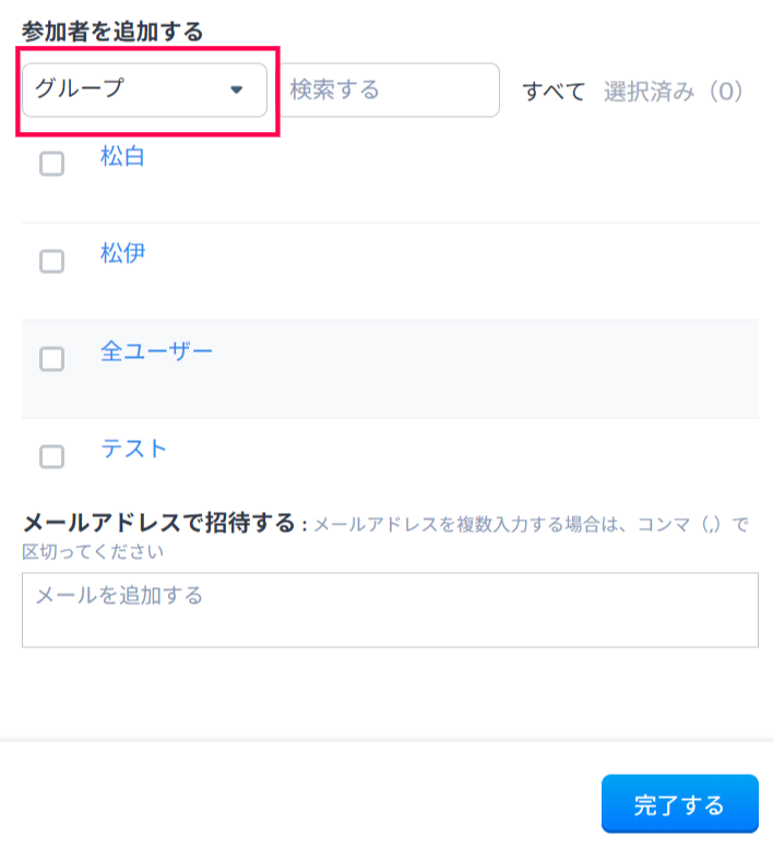 「参加者」設定では、様々な単位で参加者を登録することができ、その中に「グループ」単位がありますので、ご活用いただければ幸いです。