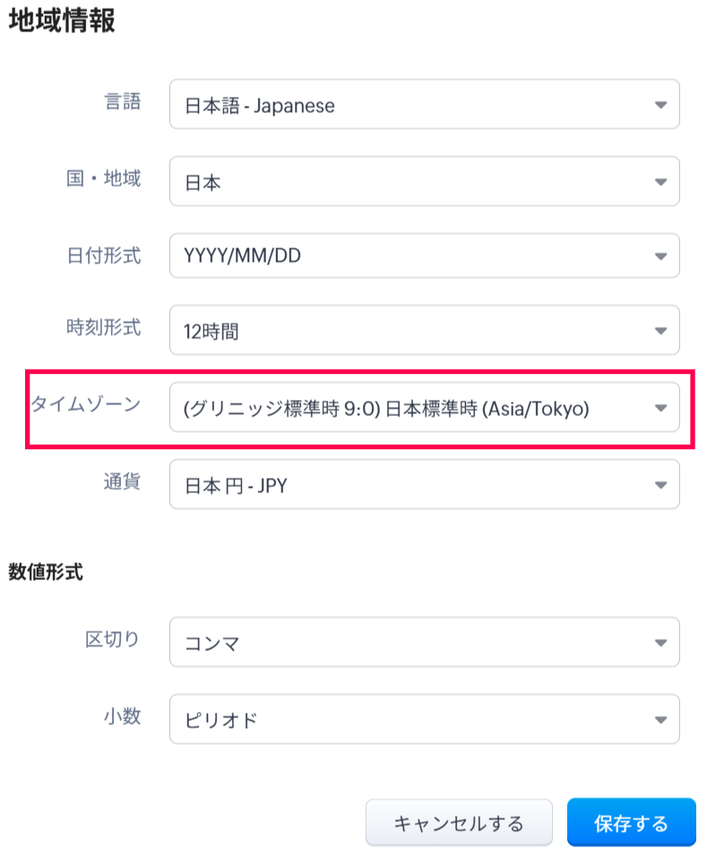 設定→一般→組織設定と移動すると、組織情報が表示されます。 その画面上で、タイムゾーンの右に表示される鉛筆マークをクリックすると編集できます。