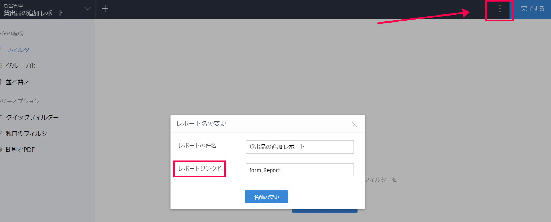 「レポート」のリンク名を確認・編集する方法はこちらのページをご参照いただけます。