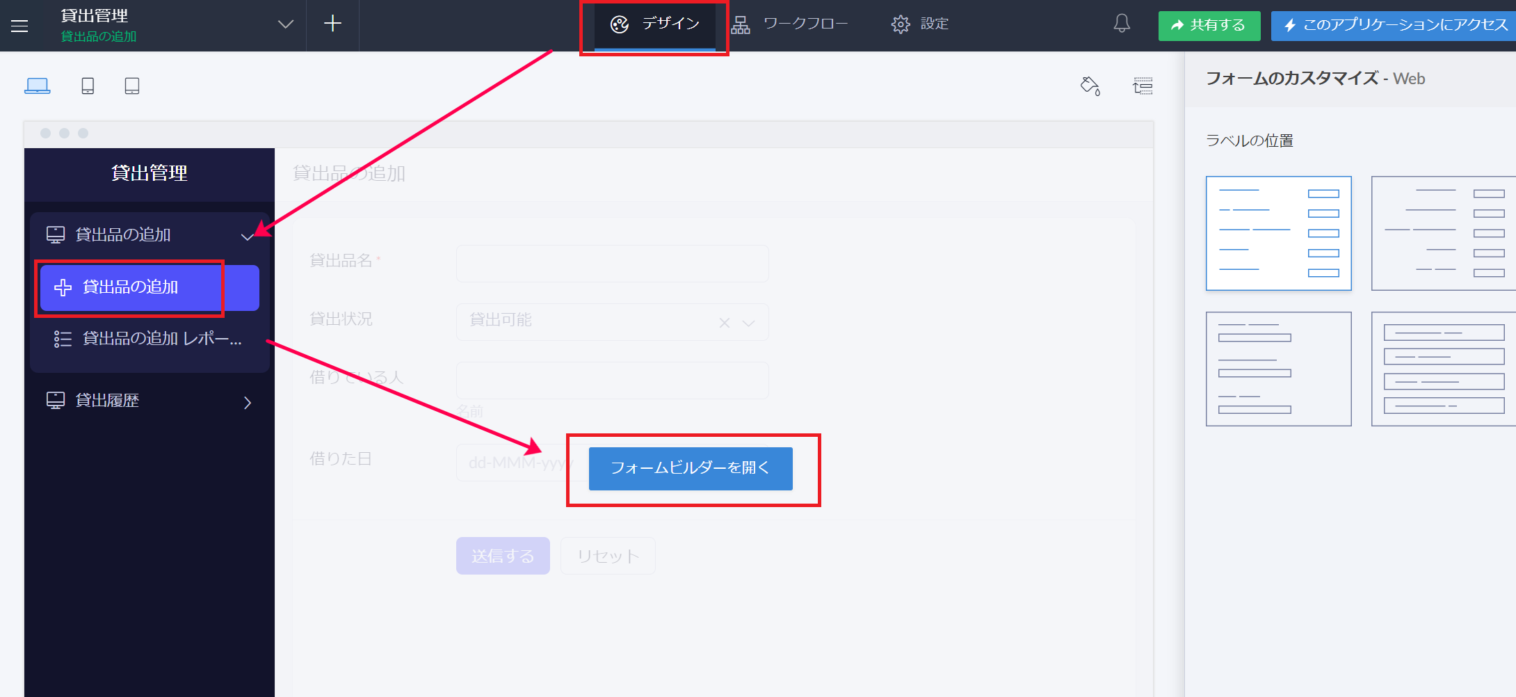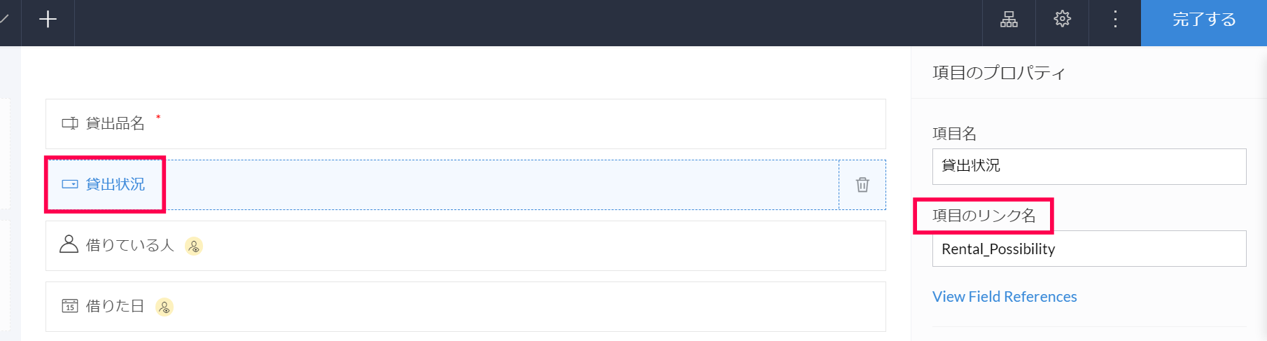 「Application」を適宜選択することで、他のアプリケーションで使用しているフォームや項目のリンク名も確認できます。