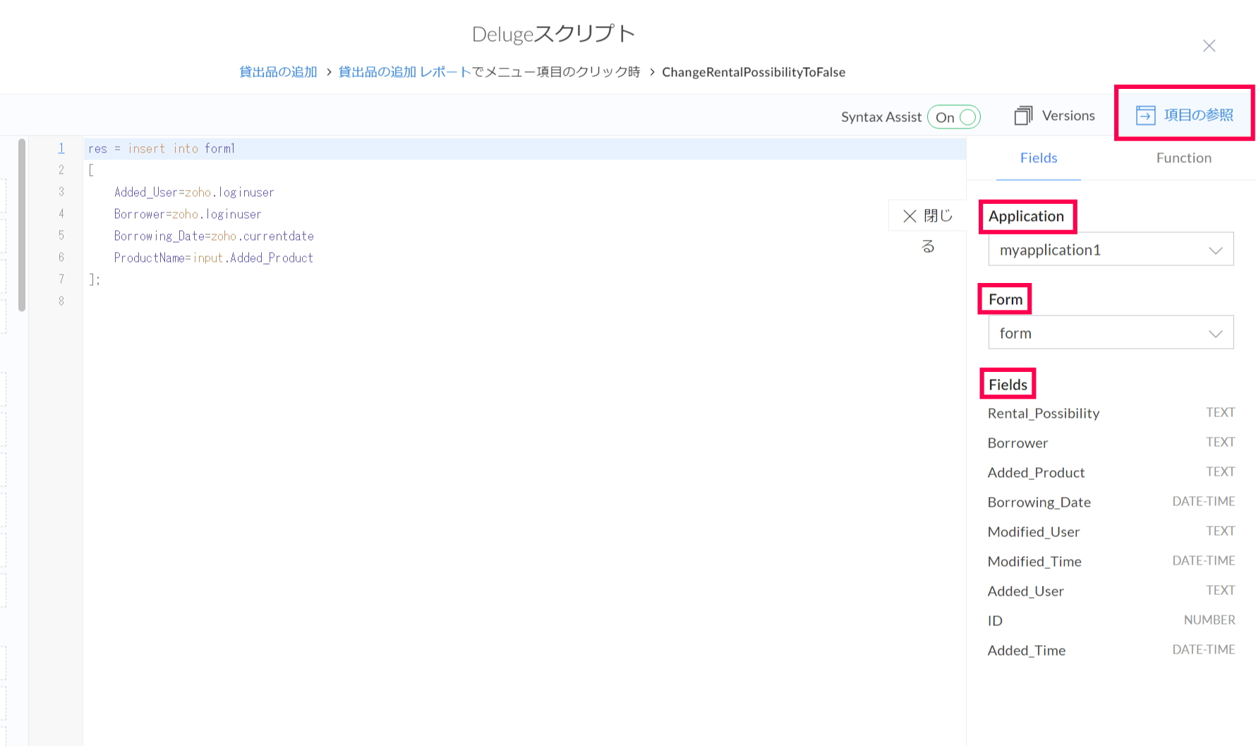 スクリプト記述画面右上の「項目の参照」をクリックすることで、「フォーム(Form)」や「項目(Fields)」のリンク名を確認できます。