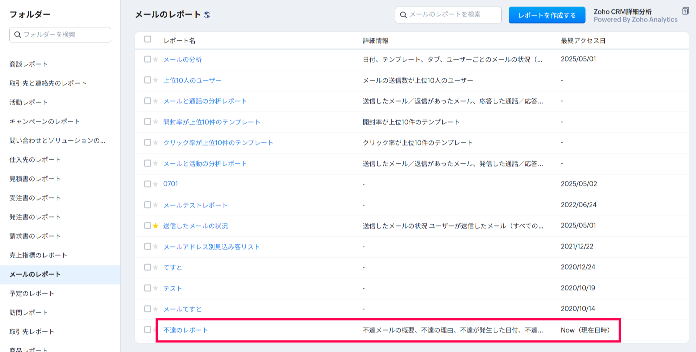 デフォルトで用意されている「不達のレポート」にて、不達になったメールの詳細を確認できます。