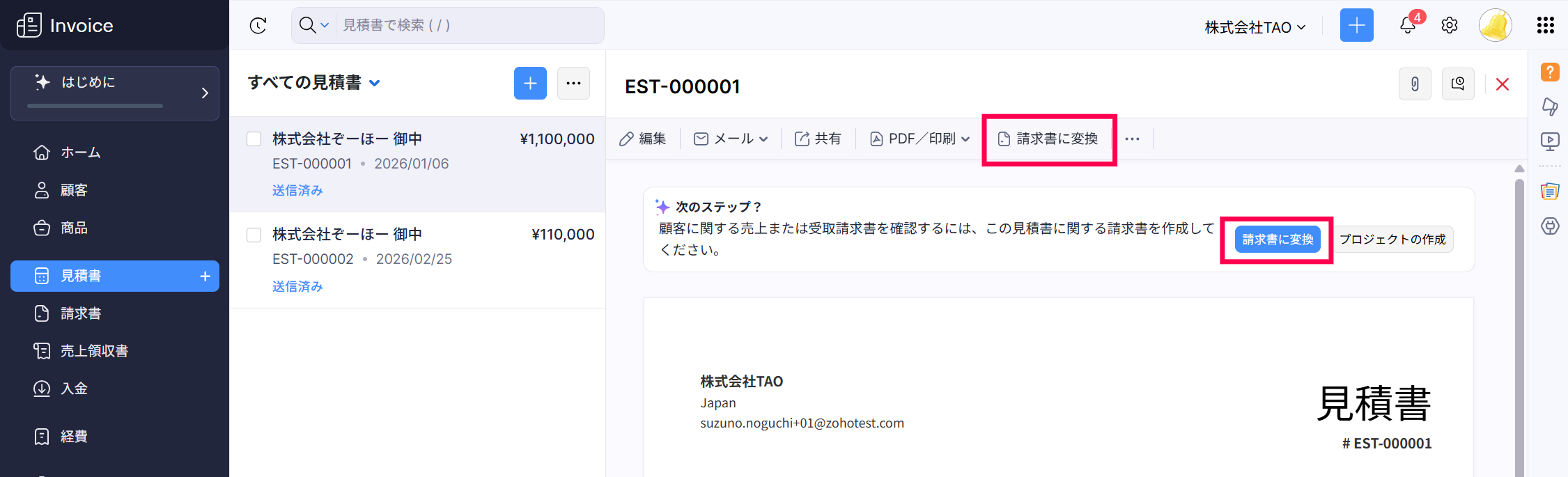 【Zoho Invoice】見積書を請求書に変換する方法