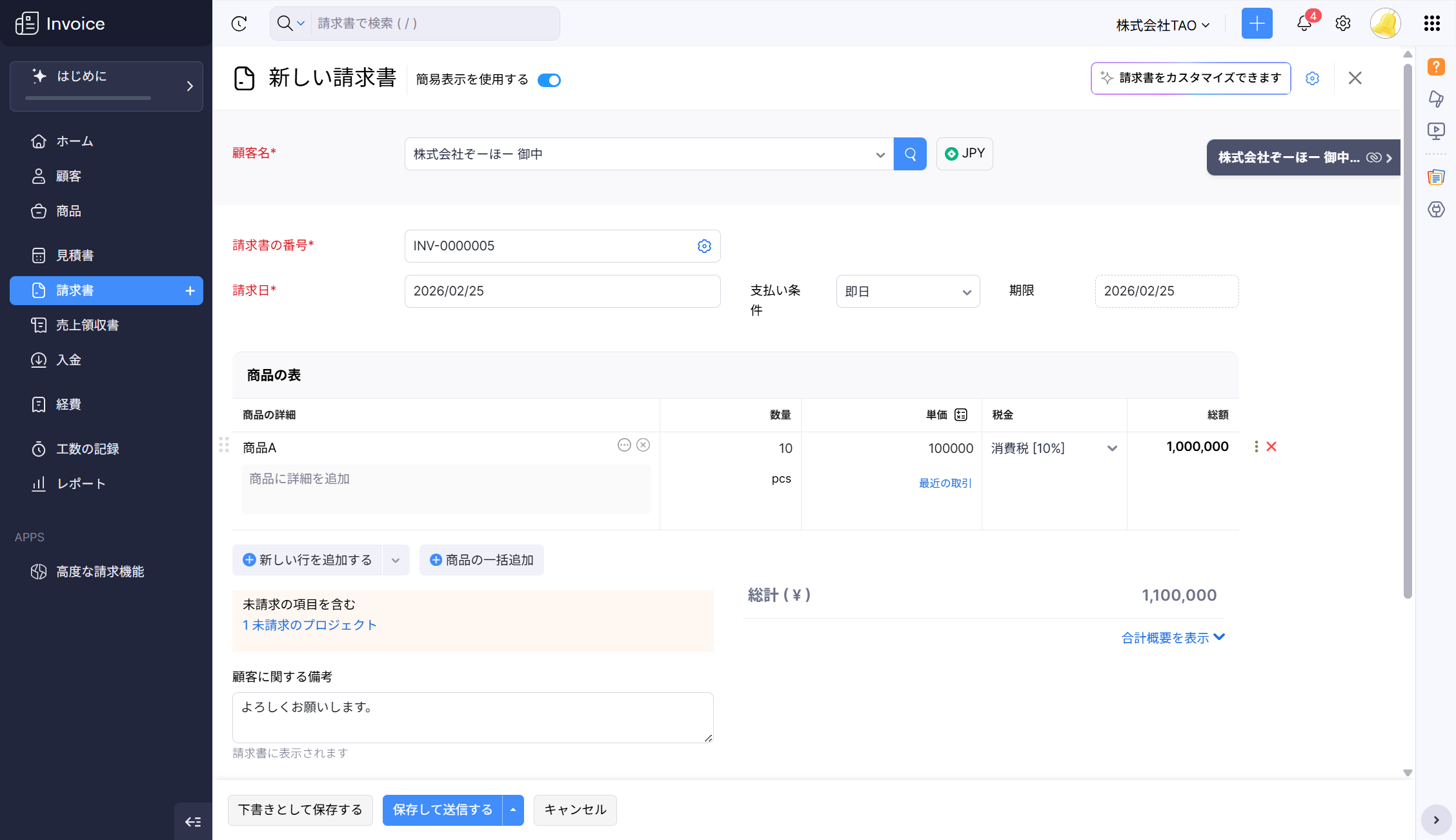 その後、「新しい請求書」の作成画面に切り替わります。