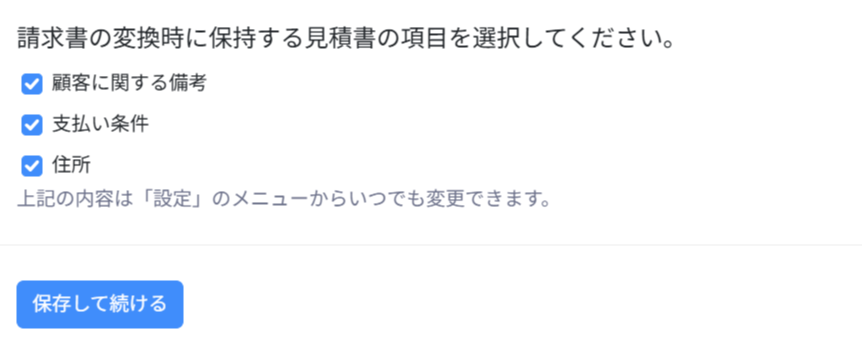 「請求書に変換」オプションをクリック後、変換時に保持する見積書の項目に関するポップアップ画面が表示されるので、必要に応じて項目を選択し、「保存して続ける」ボタンをクリックします。