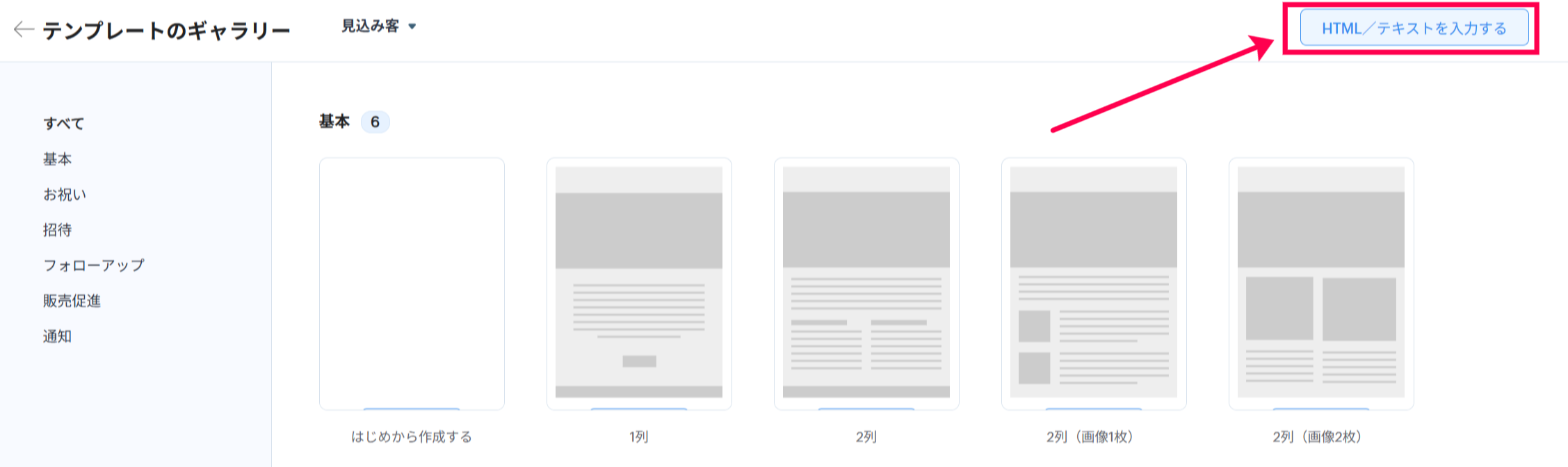 テンプレートの作成時に、画面右上の「HTML/テキストを入力する」をクリックします。