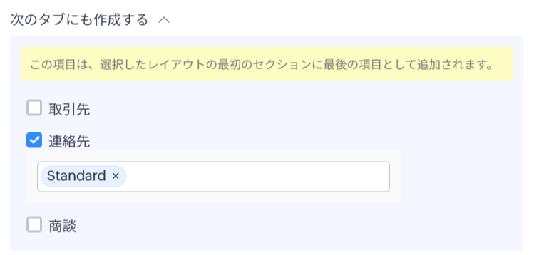 見込み客タブで複数選択リスト項目を作成する際、「次のタブにも作成する」オプションで「連絡先」タブを有効化すると、同内容の複数選択リスト項目を連絡先タブにも作成することが可能です。