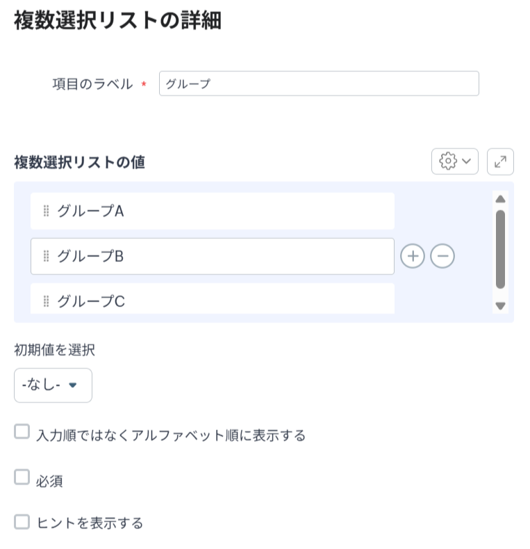 Aグループ、Bグループ、Cグループ といったようにグループを管理するカスタムの複数選択リスト項目を作成していただければと存じます。