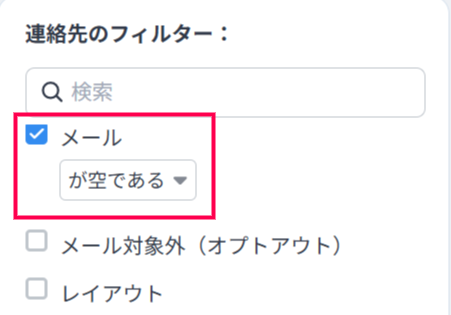 なお、フィルターで「メール」項目が空であるという条件を設定することでも、同様にメールアドレスの値が空である連絡先を抽出可能です。