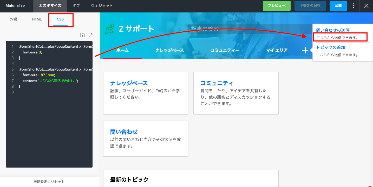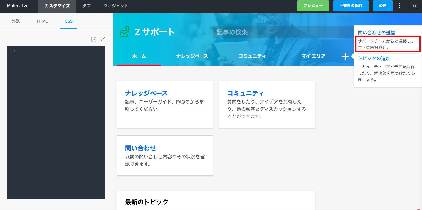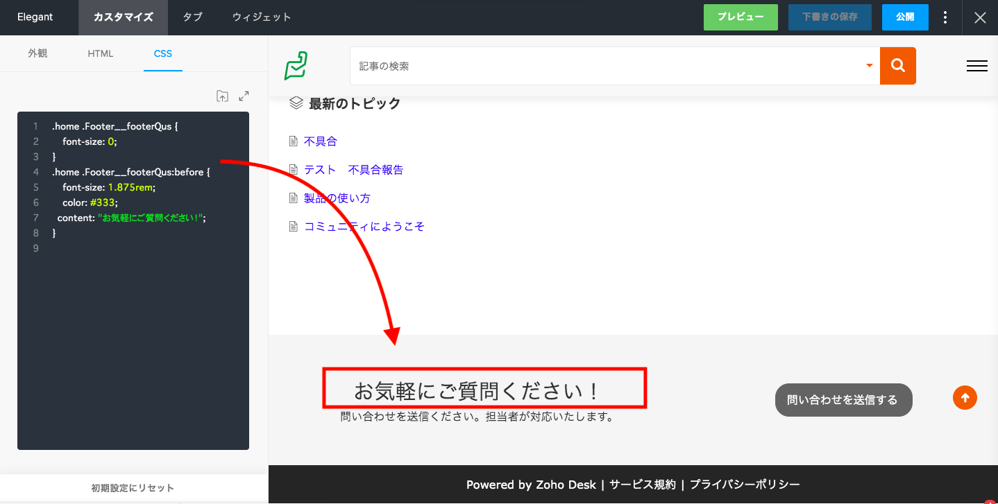 【Zoho Desk】CSSによるヘルプセンターのカスタマイズ (エレガント フッター / マテリアライズ 問い合わせ送信箇所)