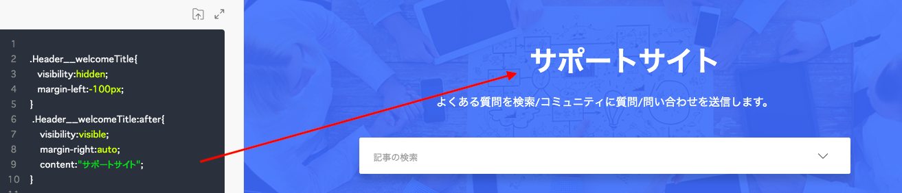 ホーム画面の「ようこそ」と、「FAQを検索/コミュニティに質問/問い合わせを送信します。」部分 以下、エレガントの場合のサンプルコードとなります。 ----------------------------------------------- .Header__searchTitle{ visibility:hidden; } .Header__searchTitle:after{ visibility:visible; content:"テスト"; } ...