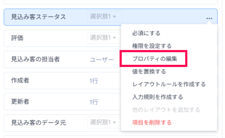 - 「見込み客ステータス」項目右の「プロパティの編集」をクリックします