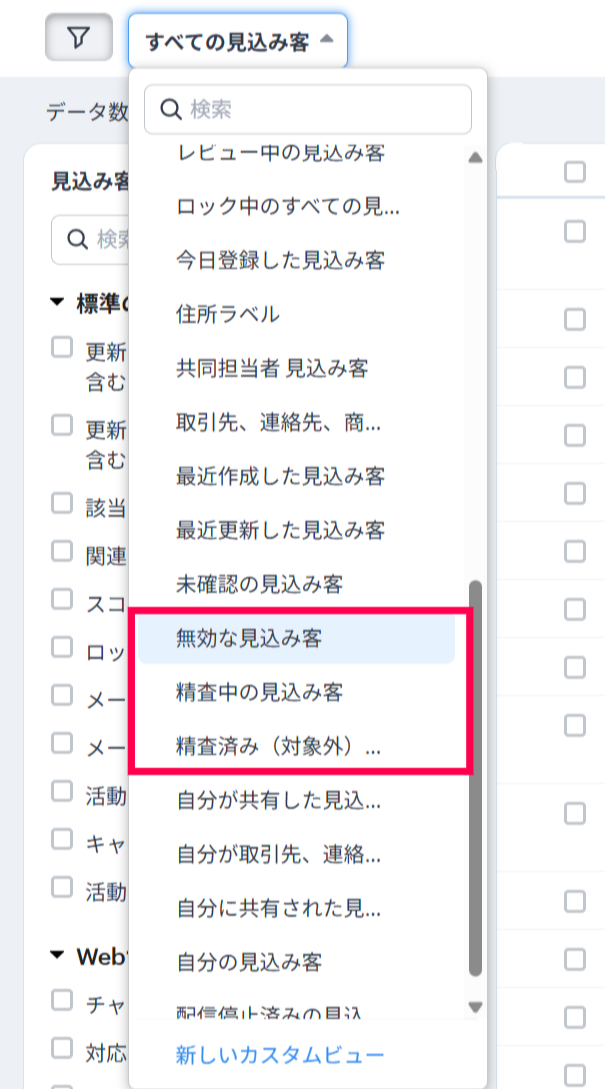 右側の「未完了・精査済み(対象外)・無効」項目(赤枠内)は見込み客タブ内のデフォルトのフィルターにてご活用いただけます。