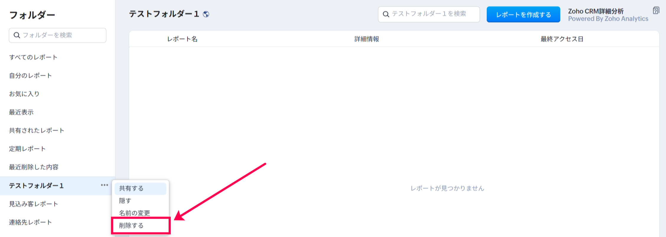 削除したいレポートフォルダー内のレポートが完全に削除されますと、そのレポートフォルダーを削除することができます。