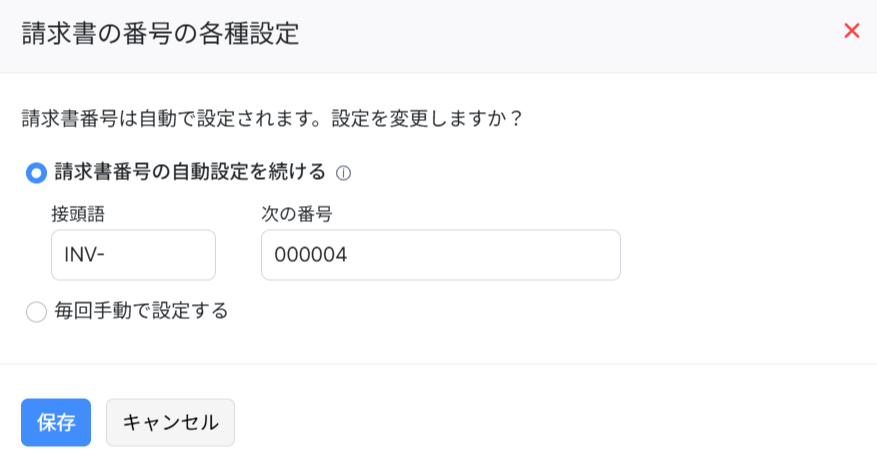 また、項目欄右の「設定」アイコンをクリックすることで、請求書の番号に関する設定を変更できます。