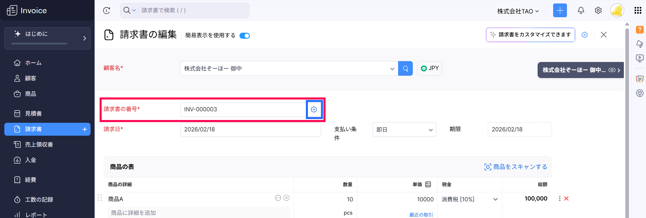 「請求書の番号」項目欄をクリックすると、手動での編集が可能です。