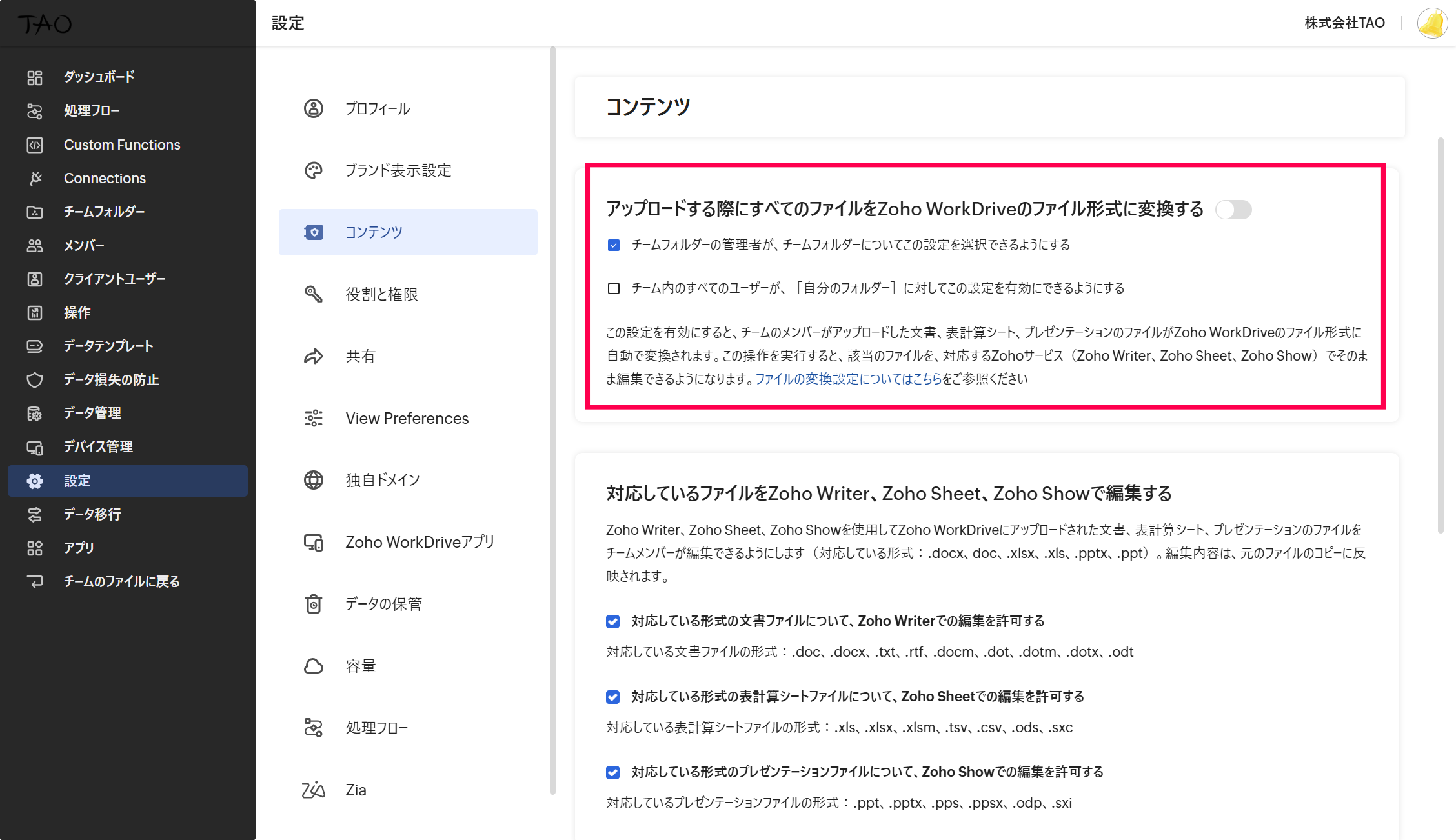 【Zoho WorkDrive】組織単位:アップロード時にファイル形式の自動変換を有効/無効にする方法