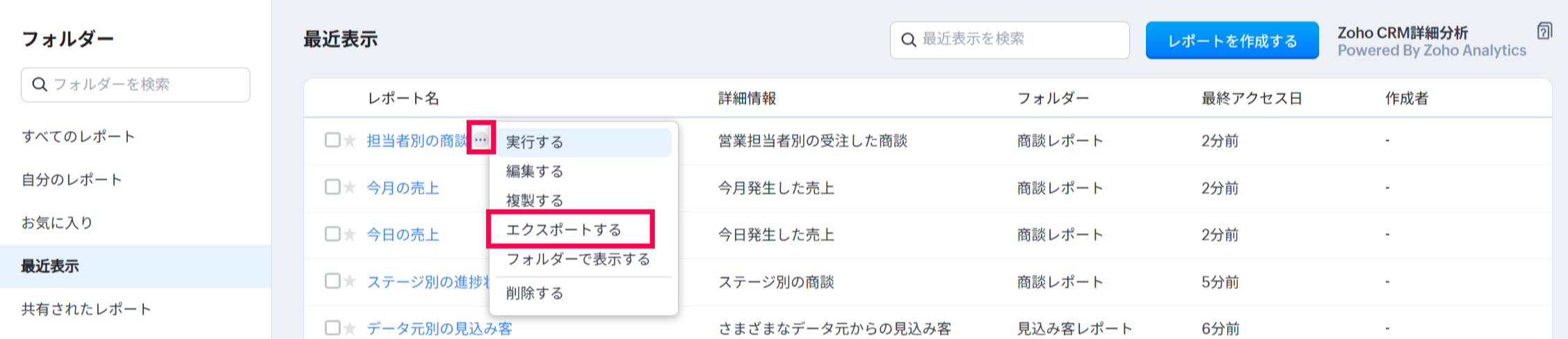 エクスポートしたいレポートにカーソルを合わせると表示される「