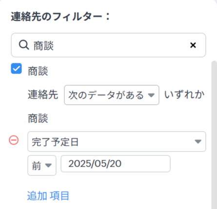 連絡先タブ内で、「完了予定日」がある特定の日付より前である商談データを持つ連絡先データを抽出したいです。可能でしょうか?