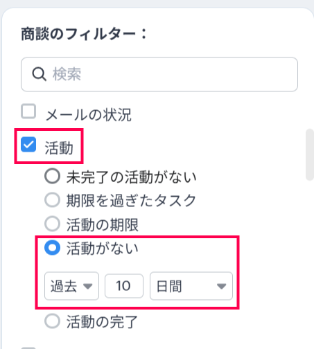 商談タブ画面左の「商談のフィルター」セクションにて「活動」項目にチェックを入れ、新たに表示される「活動なし」を選択します。
