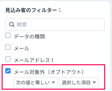 また、別の方法として、詳細フィルターで以下のような条件を設定すると、メール対象外(オプトアウト)が有効になっているデータを抽出できます。