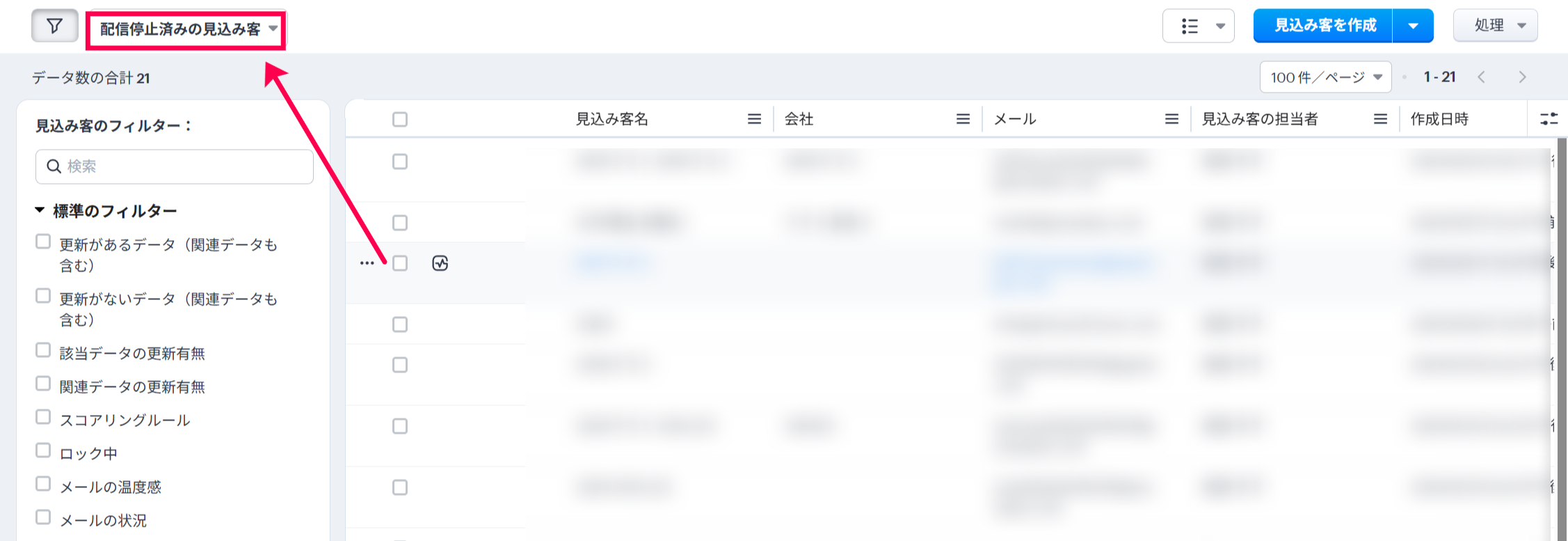 例えば、見込み客タブの場合、「配信停止済みの見込み客」ビューを使用することで、メール対象外(オプトアウト)が有効になっているデータが表示されます。