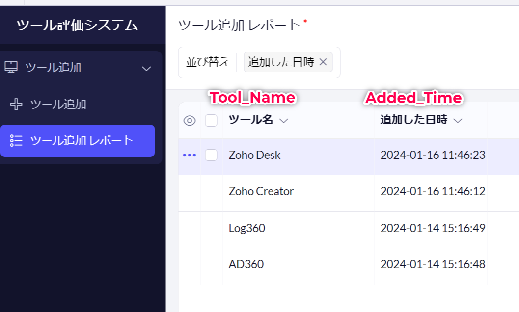 - // 最も新しく追加されたデータの特定の項目値を使用するためには、「records.<特定項目のリンク名>」を使用できます。「Delugeスクリプトの補足」における画像のようにデータが追加されている場合、「追加した日時(Added_Time)」がより新しいデータの「ツール名」である「Zoho Desk」が、変数「mostRecentToolName」に代入されています。