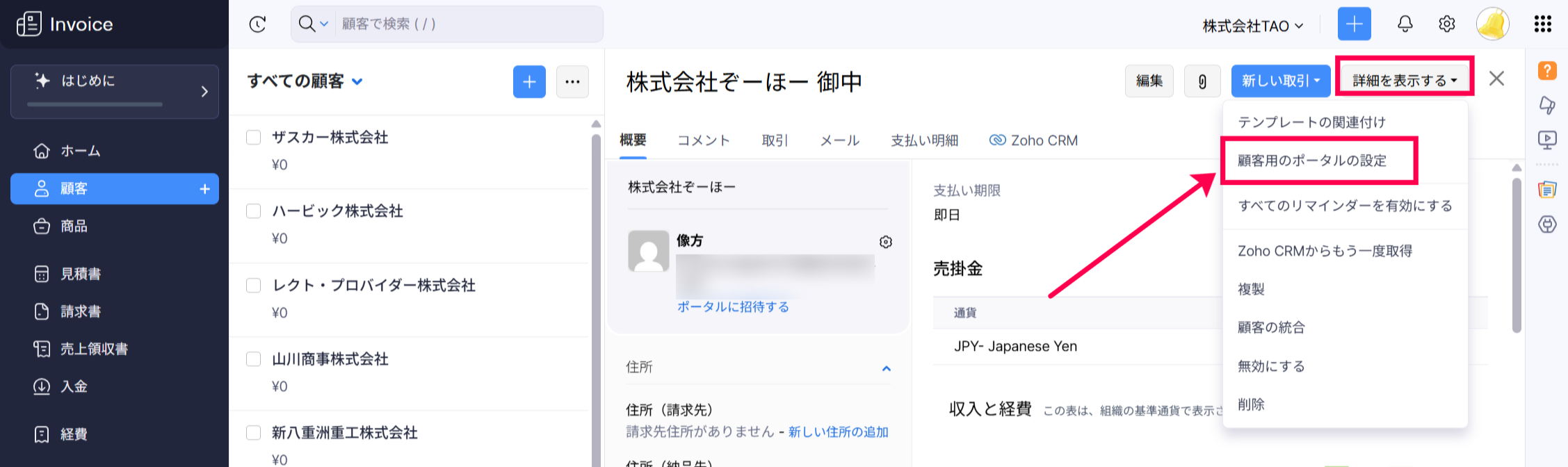 - 顧客詳細画面右上の詳細を表示する>顧客用のポータルの設定をクリックします。