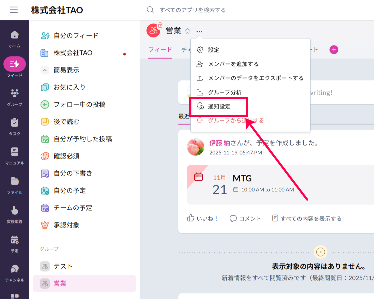 グループに関する通知を管理したい場合には、通知を管理したいグループへとアクセスし、画面上部のグループ名右に表示される「・・」・から「通知設定」をクリックします。各通知のチェックボックスを無効化することで、対象の通知が無効化されます。