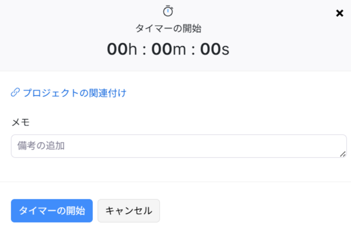 - 「工数の記録」タブ内の「開始」ボタンをクリック後、ポップアップ画面内の「タイマーの開始」ボタンをクリックします。