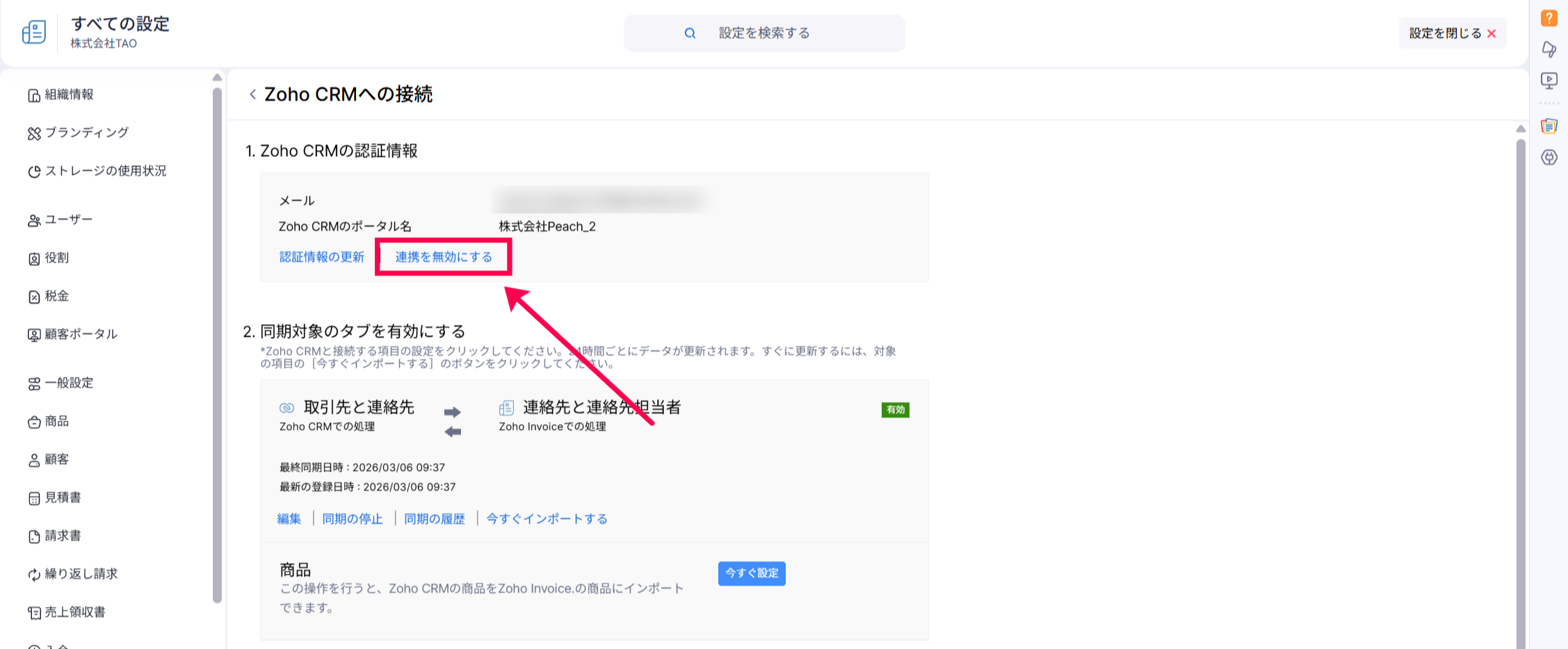 Zoho CRM連携の無効化は、設定>連携>Zoho CRM>詳細の表示画面へと移動し、以下の「連携を無効にする」リンクより可能です。