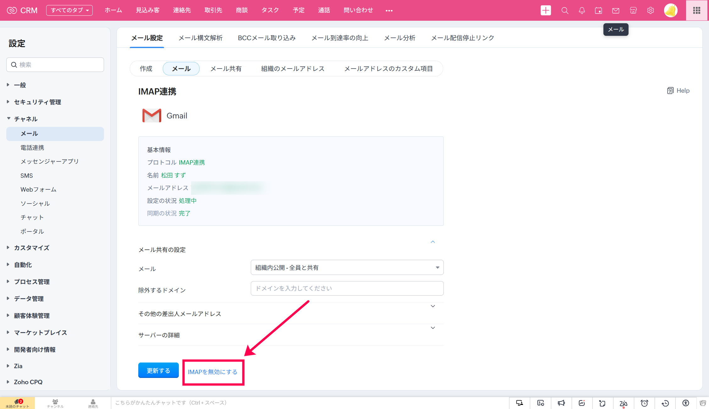 メールの設定画面下にある「IMAPを無効にする」リンクから無効化すると、IMAP連携が解除されます。