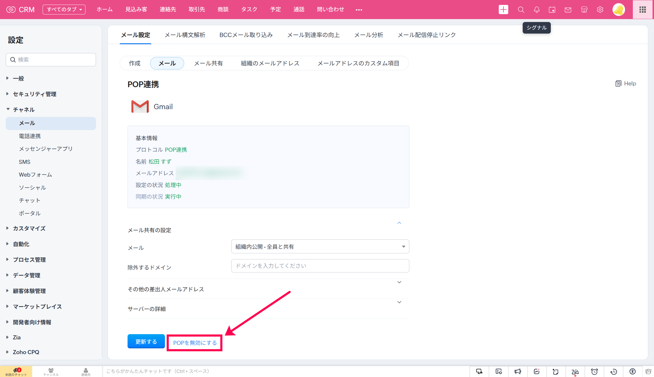 【Zoho CRM】POPメール連携の解除