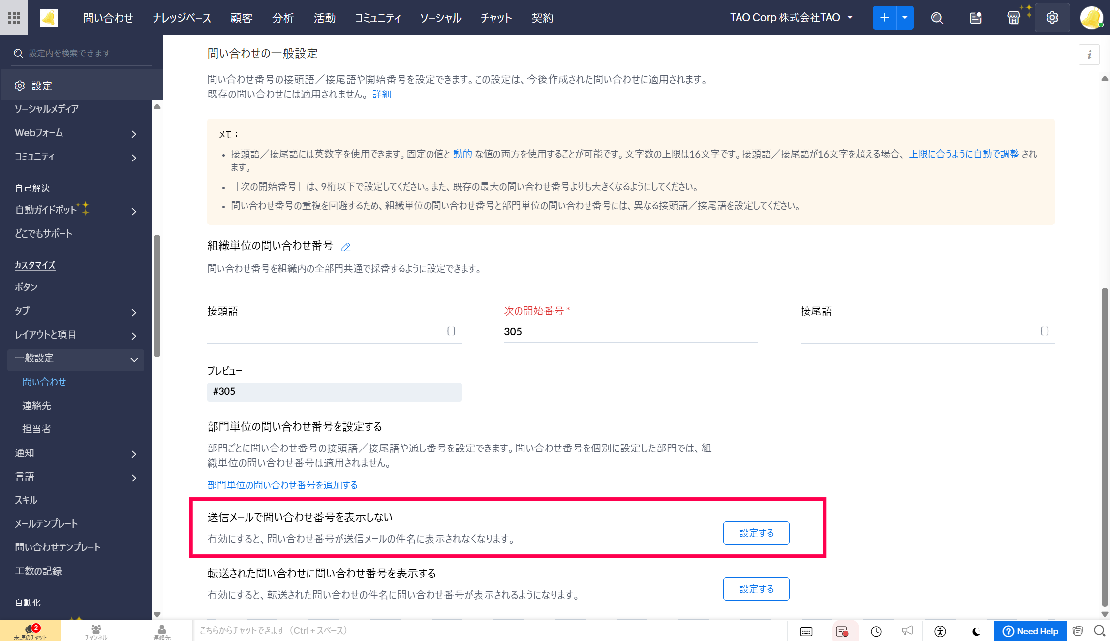 設定>カスタマイズ>一般設定>問い合わせ>送信メールで問い合わせ番号を表示しない