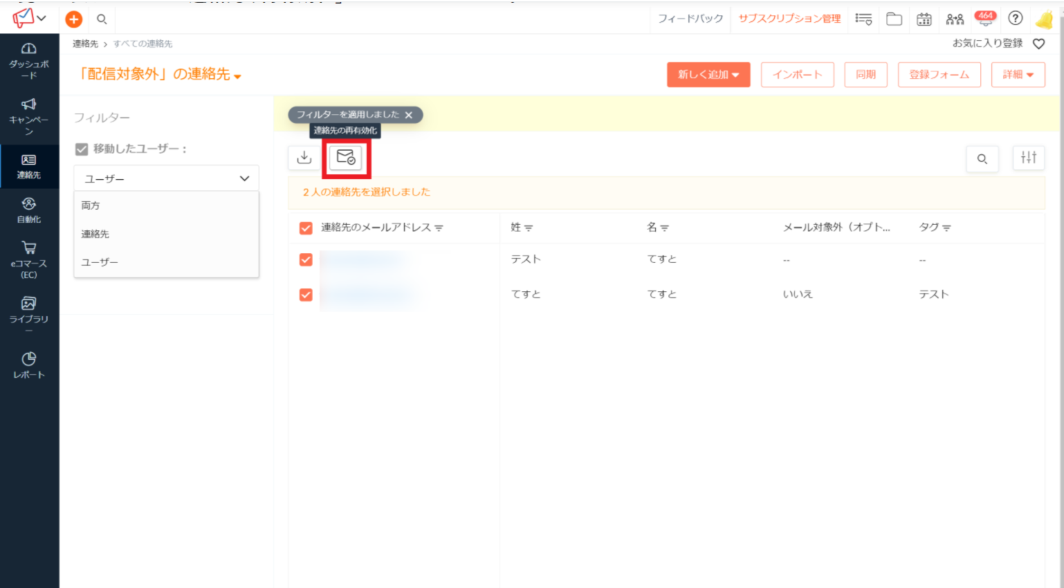 ※ドロップダウンより「ユーザー」を選択しただけでは、次ステップの「連絡先の再有効化」アイコンは表示されません。