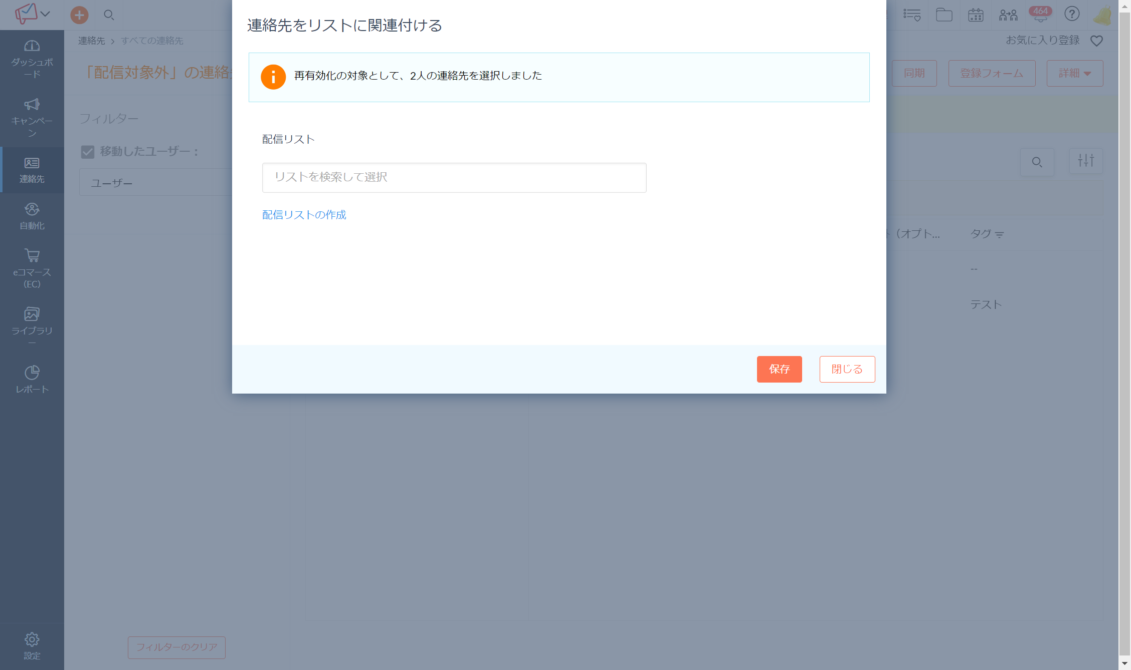 選択したメールアドレスを入れたいメール配信対象リストを選択し(複数選択可)、「保存」をクリックします。