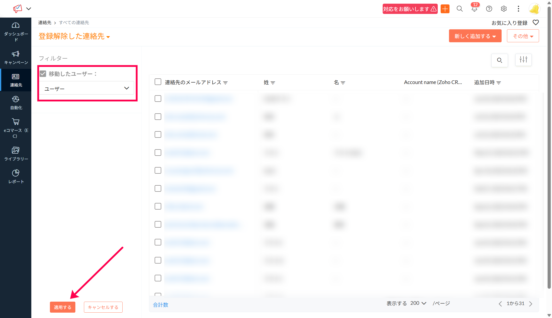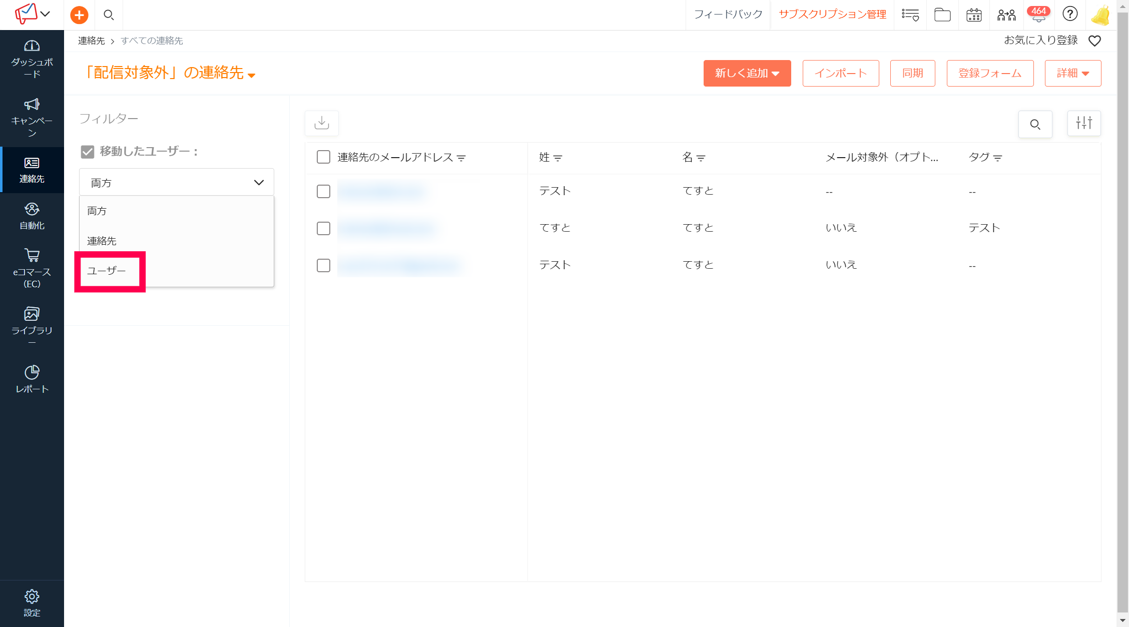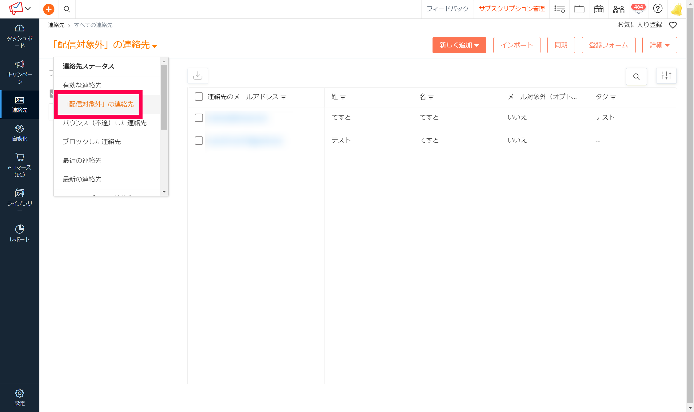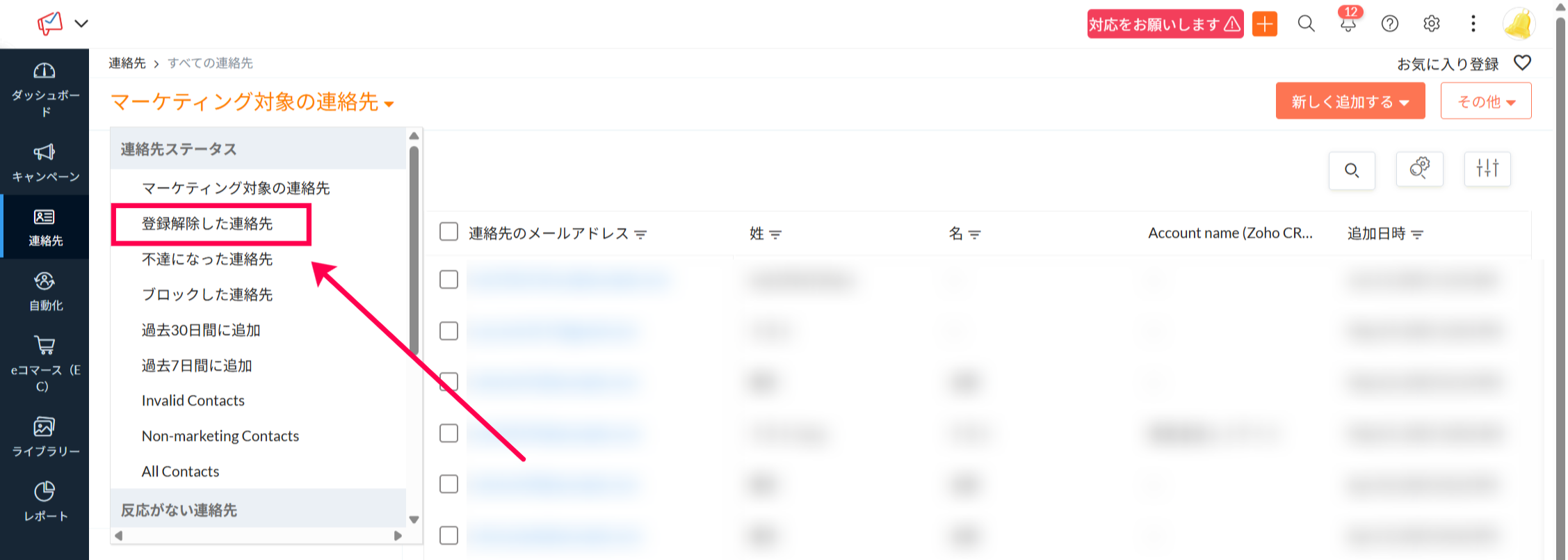 ドロップダウンリストから「登録解除した連絡先(新UI)」もしくは「「配信対象外」の連絡先(旧UI)」を選択します。