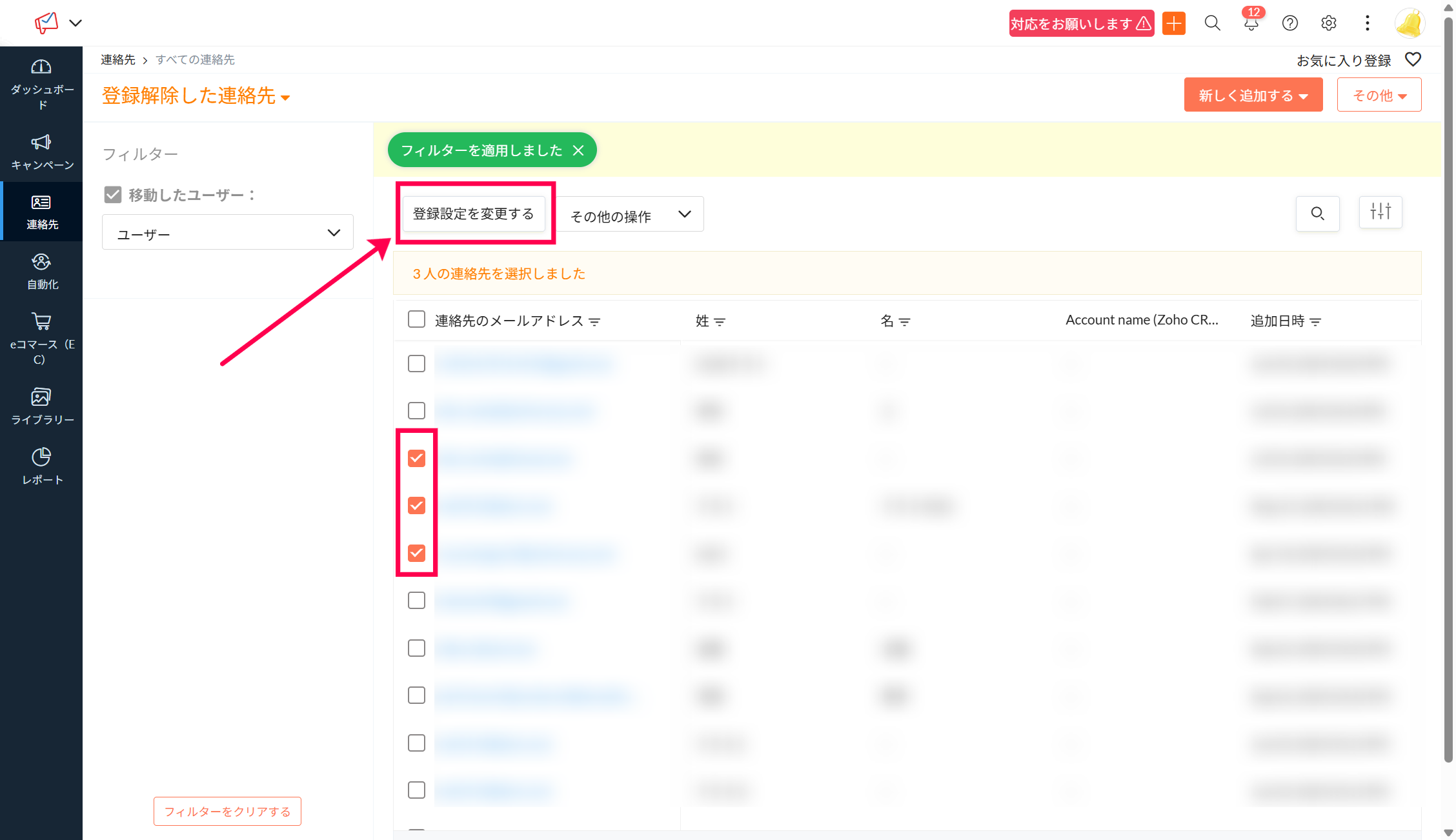 - Zoho Campaigns画面から手動で登録解除済みとして設定した場合:Campaignsの画面から有効にする